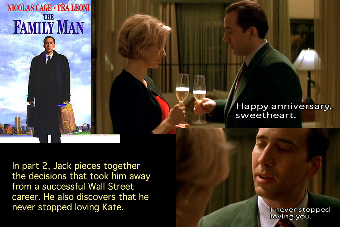 (to help you understand what yous volition see)Synopsis : Jack Campbell, a successful and aggressiveWall Street stock broker, lives a happy, single life. On Christmas Eve, he meets an "affections" who asks, "What do yous need, Jack?" Jack replies: "Zippo; I have everything I want." Well, the side by side morning, the "angel" puts Jack in a "glimpse" of what his life would have been like if he had married his college girlfriend, 13 years before. In this "glimpse," he and Kate alive in New Jersey (about an hr away from New York City), and they have two children (Annie is most v years old; Josh is still in diapers). Instead of beingness president of P.Thou. Lassiter Investment Visitor, he at present helps his father-in-police force run a retail tire store (he quit his Wall Street chore after "Big Ed" had a middle attack, thereby saving the family's company). Jack's Ferrari and expensive suits are gone; he now has a broken minivan and "mall-bought" inferior clothing (he calls them "sub-par"). Subsequently he realizes that there is zilch he can do to get his "real" life back, he settles into this "glimpse" life, and finds the value of deep friendships, family relationships, and true love. Although he misses the comfort and power of his job in "The Metropolis," he realizes that he never stopped loving Kate (and grows to love his "glimpse" children). He is no longer "confident and sure of everything," simply somewhen he decides that "there'south no place I'd rather be" than with his family.